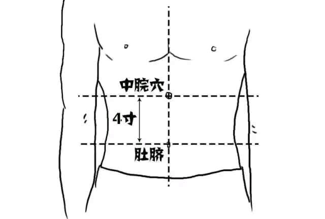 位置:中脘穴位于上腹部,胸骨下端和肚脐连接线中点(当脐中上4寸)。