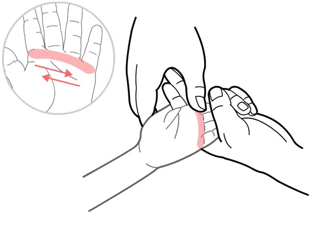 手法:用一只手握住孩子的手腕,使其掌心向上,然后用中指、食指指腹自孩子腕横纹推向肘横纹,直推300-500次,推的方向一定是从腕到肘,不可反向操作!