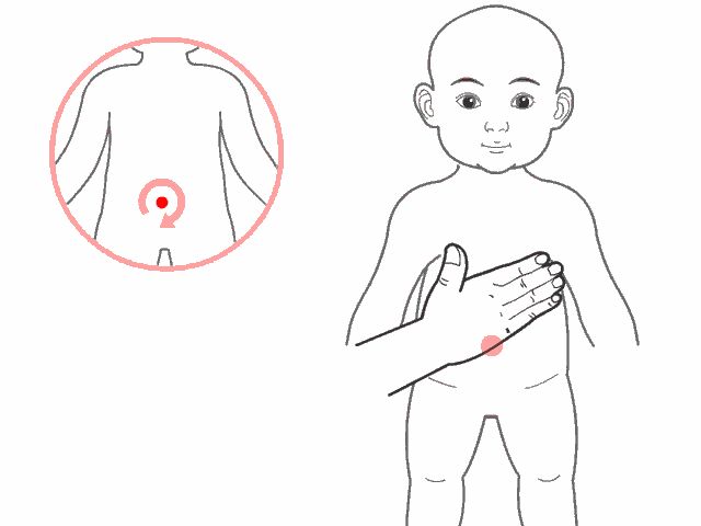 手法:以食、中、无名三指,揉动小儿肚脐直上方4寸位置之中脘穴,反复约30--50次。