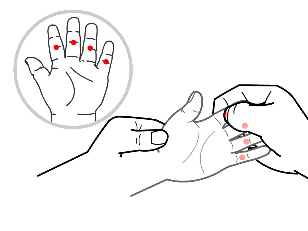 位置:在掌面示、中、环、小指掌指关节横纹处。