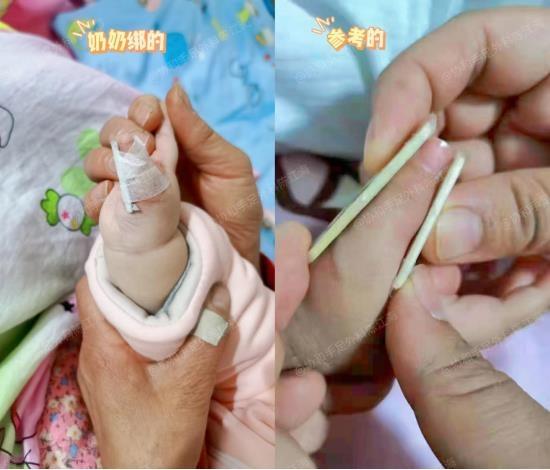 多指手术之后,为防止迟发性的术后侧偏,孩子还需佩戴夜间支具。刚开始的时候,孩子妈妈和奶奶都不会绑支具,我们就给了一张正确的照片,让孩子家里人模仿着绑。