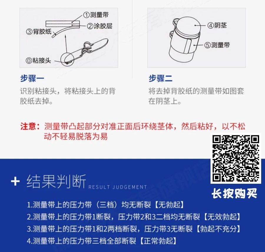 受检者在睡眠前将测试环套在疲软状态下的阴茎上,在睡眠中阴茎勃起达到四级健康的勃起硬度时便会拉断纤拉带。